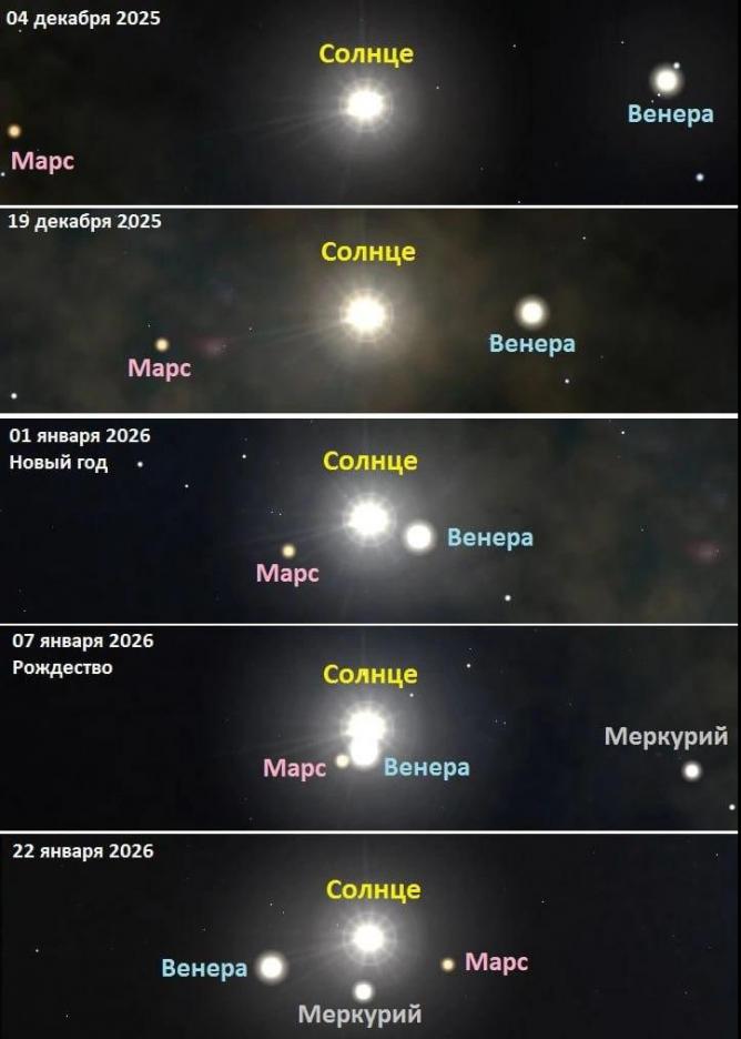 Как сообщила Лаборатория солнечной астрономии Института космических исследований (ИКИ) РАН, к Рождеству Солнце, Венера и Марс практически сольются в одну точку, образуя своеобразную Вифлеемскую звезду.
